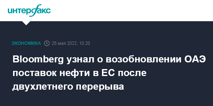Москва. 25 мая. INTERFAX.RU - Объединенные Арабские Эмираты после двухлетнего перерыва начали поставлять редкие партии нефти в Европу, пренебрегающую импортом сырья из России, сообщает Bloomberg со ссылкой на данные отслеживания танкеров.