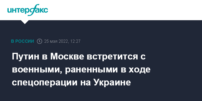 Москва. 25 мая. INTERFAX.RU - Президент РФ Владимир Путин в среду посетит один из московских военных госпиталей, где проходят лечение раненные в ходе спецоперации на Украине военнослужащие, рассказал его пресс-секретарь Дмитрий Песков.