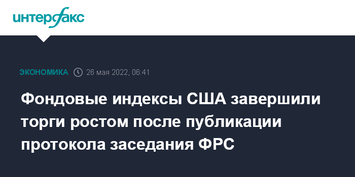 Москва. 26 мая. INTERFAX.RU - Американские фондовые индексы выросли по итогам торгов в среду, трейдеры оценивали протокол заседания Федеральной резервной системы (ФРС) от 3-4 мая.