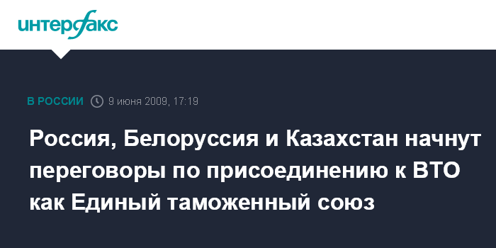 Москва. 9 июня. INTERFAX.RU - Россия, Белоруссия и Казахстан начнут переговорный процесс по присоединению к ВТО как Единый таможенный союз, заявил премьер-министр РФ Владимир Путин на брифинге по итогам заседания Высшего органа таможенного союза во вторник в Москве. Кроме того, по его словам, был одобрен проект единого таможенного тарифа, имея в виду его вступление в действие с 1 января 2010 года.