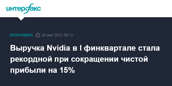 Москва. 26 мая. INTERFAX.RU - Американский производитель графических процессоров Nvidia Corp зафиксировал рекордную выручку в первом финансовом квартале, однако чистая прибыль компании уменьшилась на 15%.