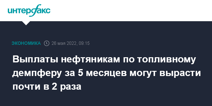 Москва. 26 мая. INTERFAX.RU - Нефтяные компании могут получить выплаты из бюджета по топливному демпферу в мае в размере около 230-240 млрд руб. Это сопоставимо с выплатами за апрель, которые составили около 260 млрд руб. (распределится между бензином и дизелем примерно в соотношении 45% на 55%).