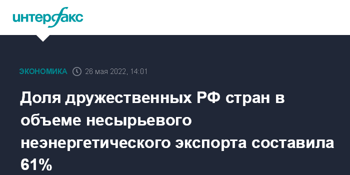 Доля дружественных РФ стран в объеме несырьевого неэнергетического экспорта составила 61%