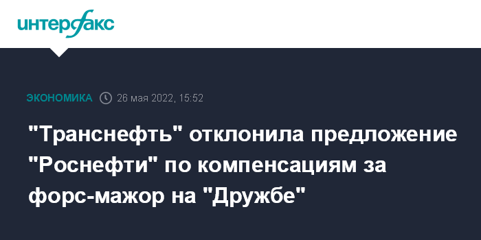 Москва. 26 мая. INTERFAX.RU - "Транснефть" проинформировала вице-премьера РФ, председателя совета директоров монополии Александра Новака о неприемлемости предложений "Роснефти" по выплатам компенсаций из-за форс-мажора на магистральном нефтепроводе "Дружба" в 2019 году.