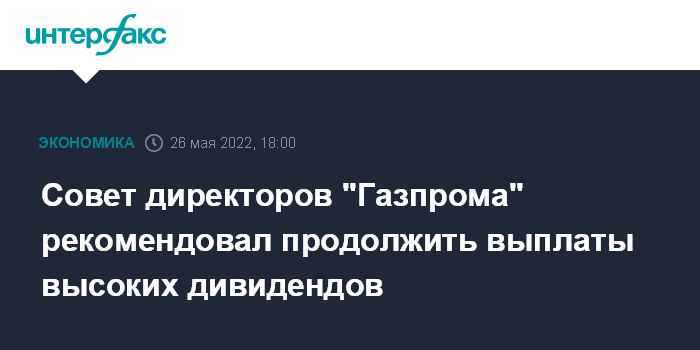 Москва. 26 мая. INTERFAX.RU - Совет директоров "Газпрома" на заседании в четверг рекомендовал годовому собранию принять решение о выплате по итогам 2021 года дивидендов в размере 52,53 рубля на одну обыкновенную акцию, говорится в сообщении эмитента.
