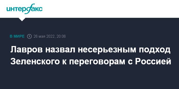 Москва. 26 мая. INTERFAX.RU - Глава МИД РФ Сергей Лавров назвал несерьёзными недавние заявления президента Украины Владимира Зеленского относительно его видения переговоров между Москвой и Киевом.