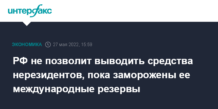 Москва. 27 мая. INTERFAX.RU - Власти продолжат отменять капитальные ограничения, введенные в конце февраля - начале марта, но запрет на вывод средств нерезидентов сохранится, пока международные резервы России будут заморожены, заявил министр финансов РФ Антон Силуанов.