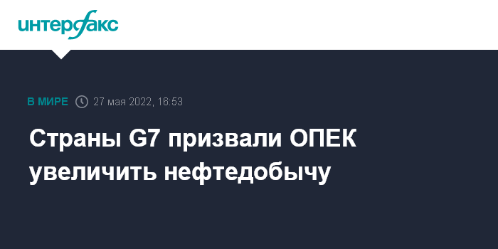 Москва. 27 мая. INTERFAX.RU - Министры энергетики и климата стран G7 призвали страны ОПЕК увеличить добычу нефти на фоне резкого скачка цен на топливо.