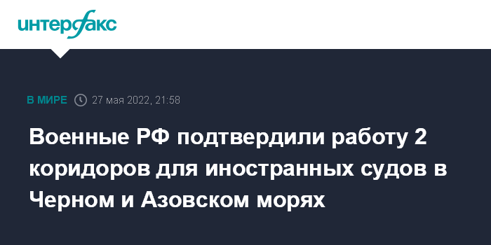 Москва. 27 мая. INTERFAX.RU - Два гумкоридора в Черном и Азовском морях для иностранных судов продолжают работу, сообщили в Минобороны РФ.