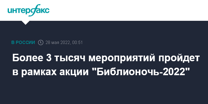 Москва. 28 мая. INTERFAX.RU - В рамках ежегодной всероссийской акции "Библионочь-2022", которая пройдет 28 мая, в России состоится более 3 тыс. мероприятий, сообщила заместитель директора департамента региональной политики, образования и проектного управления Министерства культуры РФ Лидия Федякина.