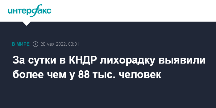Москва. 28 мая. INTERFAX.RU - Заболеваемость в КНДР тем, что власти называют лихорадкой, идет на спад, число заболевших опустилось ниже отметки в 100 тыс., о смертельных случаях не сообщается, пишет в четверг южнокорейское агентство "Ренхап".