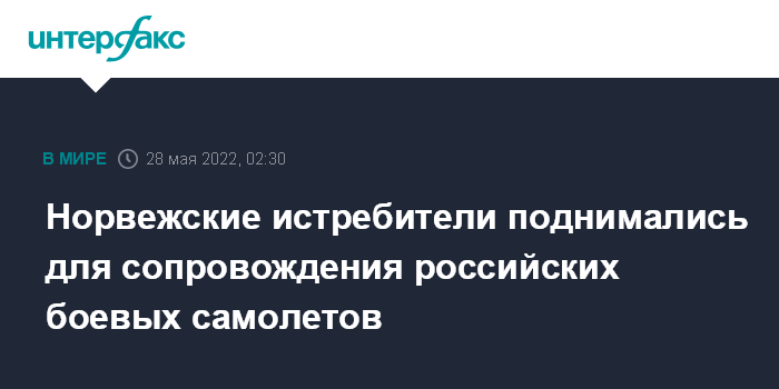 Москва. 28 мая. INTERFAX.RU - Норвежские истребители F-35 поднимались для идентификации и сопровождения российских боевых самолетов, осуществивших полет к северу от берегов страны, сообщили Королевские ВВС.