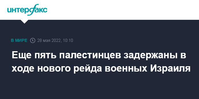 Москва. 28 мая. INTERFAX.RU - Силы безопасности Израиля в ходе рейда в ночь на субботу задержали еще пять палестинцев, подозреваемых в причастности к террористической деятельности, сообщает The Jerusalem Post.