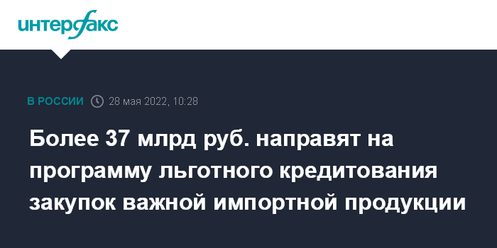 Москва. 28 мая. INTERFAX.RU - В рамках мер по повышению устойчивости экономики в условиях санкций свыше 37 млрд рублей будет направлено на субсидирование специальной программы льготного кредитования закупок важной для экономики импортной продукции. Соответствующее распоряжение подписал премьер России Михаил Мишустин.
