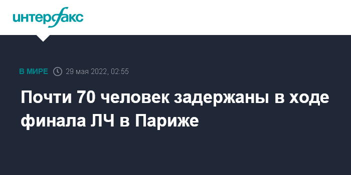 Москва. 29 мая. INTERFAX.RU - Французские полицейские задержали 68 человек в Париже во время финального матча Лиги чемпионов УЕФА между мадридским "Реалом" и "Ливерпулем", сообщает BFM TV со ссылкой на источник в полиции. Игра завершилась победой "Реала" со счетом 1:0.