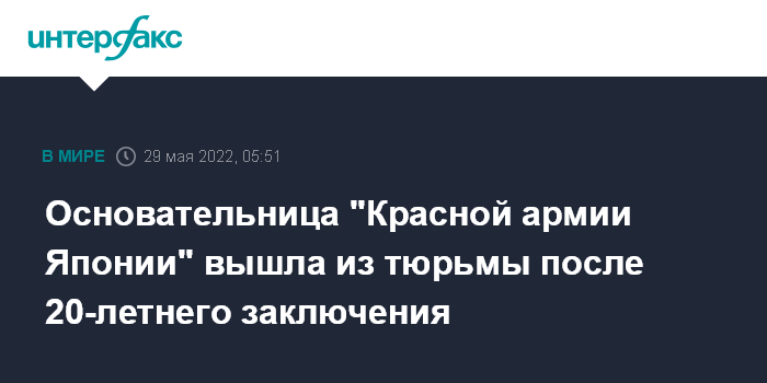Москва. 29 мая. INTERFAX.RU - Основательница ныне распущенной леворадикальной организации "Красная армия Японии" Фусако Сигэнобу освободилась из тюрьмы в субботу после отбытия 20-летнего заключения, сообщает Kyodo.