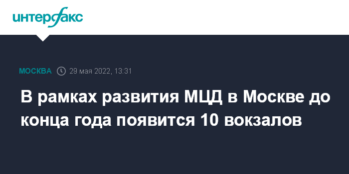 Москва. 29 мая. INTERFAX.RU - К концу 2022 года на Московских центральных диаметрах (МЦД) планируется открыть десять новых и реконструированных вокзалов, сообщил мэр столицы Сергей Собянин в воскресенье.