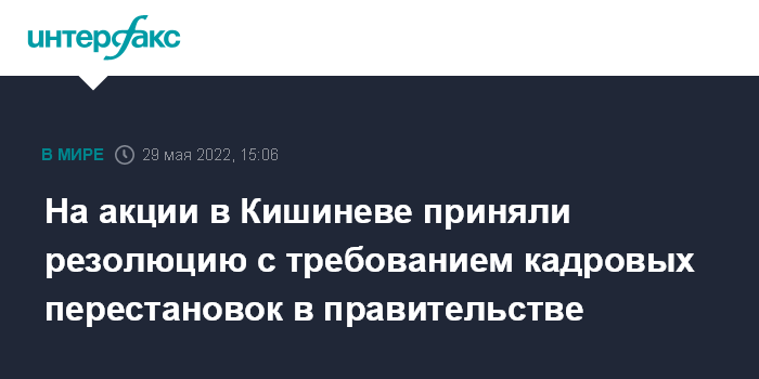 Москва. 29 мая. INTERFAX.RU - Протестующие в центре Кишинева приняли резолюцию с требованиями о кадровых перестановках в правительстве и прекращении давления на оппозицию.