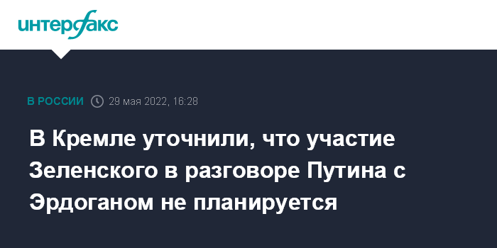 Москва. 29 мая. INTERFAX.RU - Телефонный разговор президентов России Владимира Путина и Турции Реджепа Эрдогана, запланированный на 30 мая, пройдет в двустороннем формате, участие в нем президента Украины Владимира Зеленского не планируется, пояснили в Кремле.