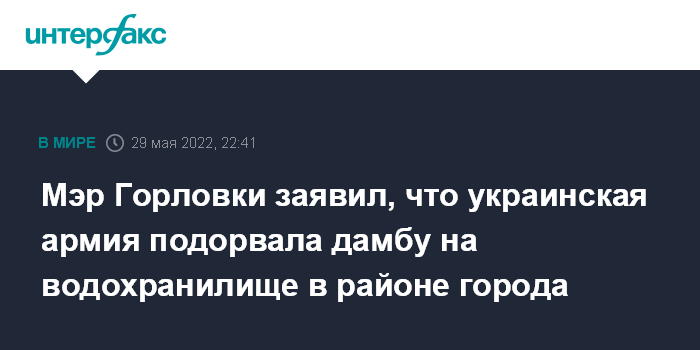 Москва. 29 мая. INTERFAX.RU - Украинская армия подорвала дамбу на водохранилище в районе Горловки в ДНР, уровень воды падает, сообщает глава администрации города Иван Приходько.