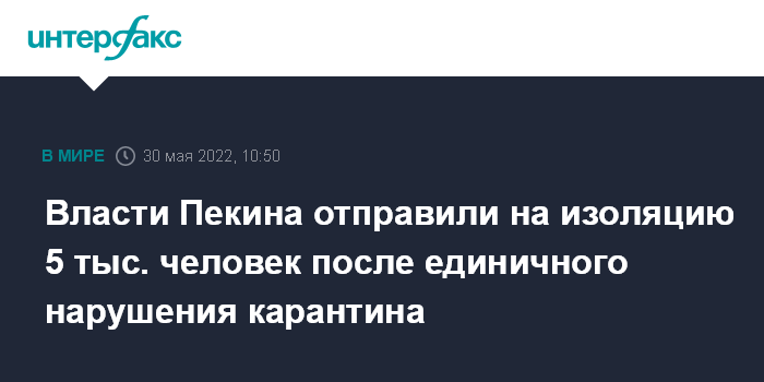 Москва. 30 мая. INTERFAX.RU - В Пекине из-за мужчины, нарушившего изоляцию в связи с COVID-19, на карантин отправились 5 тысяч человек, сообщает в понедельник The Guardian.