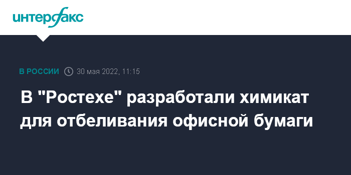 Москва. 30 мая. INTERFAX.RU - "Ростех" начал переговоры с предприятиями северо-запада России о производстве белой офисной бумаги с помощью разработанного в госкорпорации химиката.