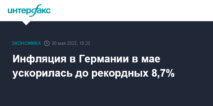 Потребительские цены, рассчитанные по германским стандартам, в мае подскочили на 7,9% за год и на 0,9% за месяц. Аналитики ожидали роста на 7,6% и 0,5% соответственно. Годовой рост стал рекордным с зимы 1973-74 годов, говорится в сообщении Destatis.
