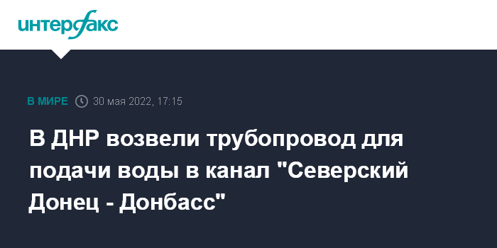 Москва. 30 мая. INTERFAX.RU - Спасатели Донецкой народной республики провели трубопровод к каналу "Северский Донец-Донбасс", он уже начал заполняться водой, заявили в МЧС ДНР.