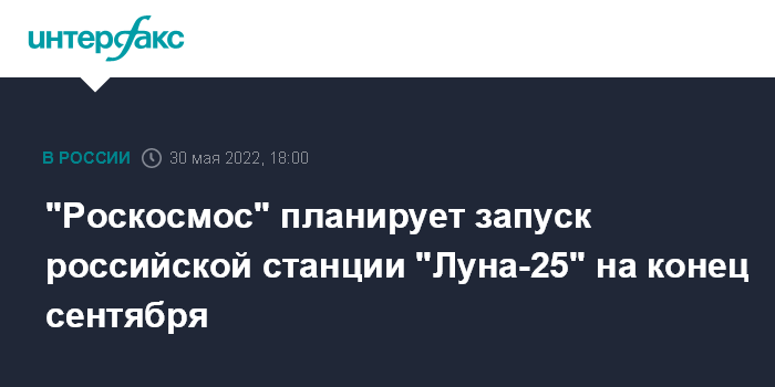 Москва. 30 мая. INTERFAX.RU - Запуск исследовательской станции "Луна-25" запланирован на конец сентября этого года, сообщил глава "Роскосмоса" Дмитрий Рогозин.