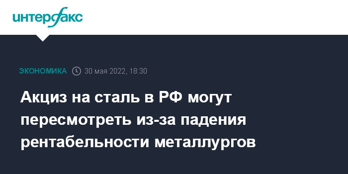 Москва. 30 мая. INTERFAX.RU - Вопрос отмены акциза на сталь требует повторного обсуждения в текущих условиях снижения рентабельности металлургов, сообщили "Интерфаксу" в Минпромторге РФ.