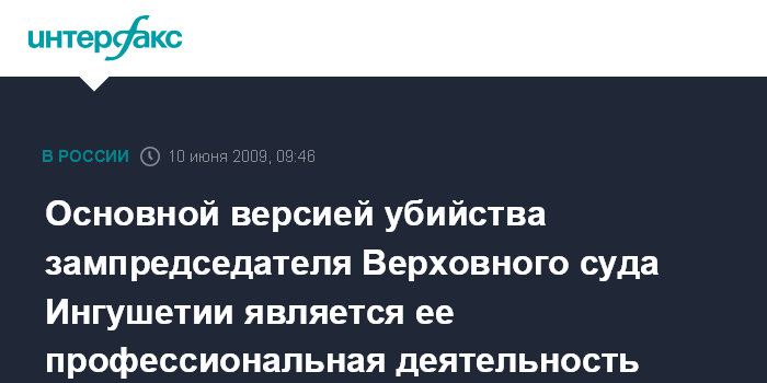 Москва. 10 июня. INTERFAX.RU - Основной версией убийства заместителя председателя Верховного суда Ингушетии Азы Газгереевой является ее профессиональная деятельность, заявил в интервью агентству "Интерфакс-Юг" в среду председатель суда Михаил Задворнов.