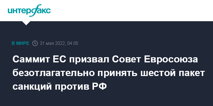 Москва. 31 мая. INTERFAX.RU - Внеочередной Европейский совет договорился в ночь на вторник по шестому пакету санкций в отношении России и потребовал его скорейшего официального принятия Советом ЕС.
