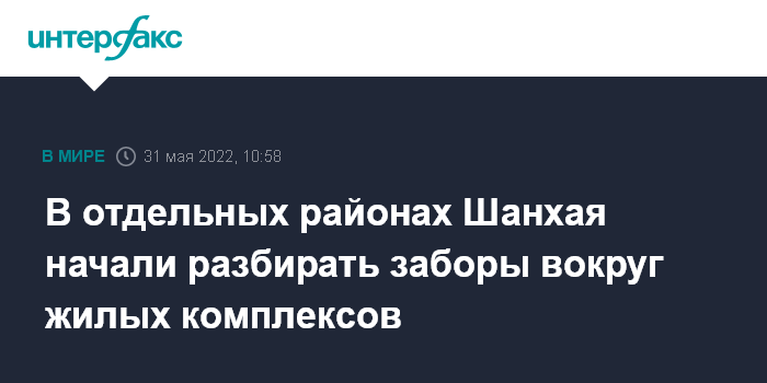 Москва. 31 мая. INTERFAX.RU - В Шанхае начале разбирать заборы, окружавшие жилые комплексы на протяжении двух месяцев локдауна, с 1 июня в городе возобновится работа транспорта, людям разрешат ездить на работу и отменят пропуска, по которым горожане могли выйти на улицу на несколько часов, пишет Guardian.