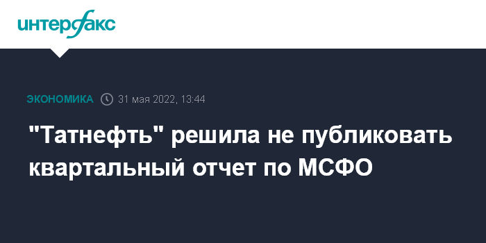 Москва. 31 мая. INTERFAX.RU - "Татнефть" решила не публиковать консолидированную финансовую отчетность группы по МСФО за первый квартал 2022 года. Об этом говорится в заявлении НК на сайте Лондонской фондовой биржи.