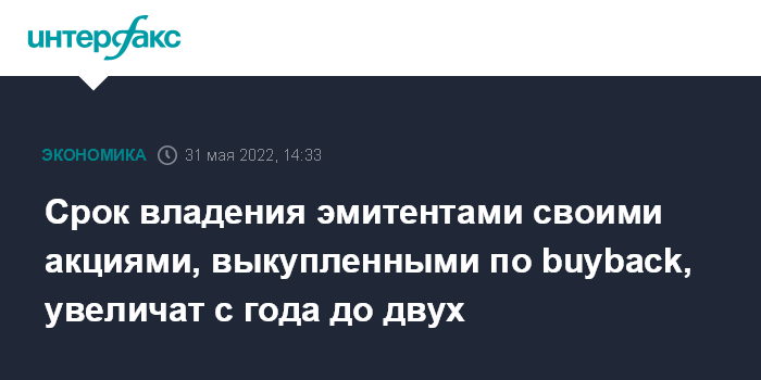 С марта до конца августа 2022 года действует упрощенный механизм приобретения публичными компаниями собственных акций (buyback) на бирже в целях поддержания их капитализации. На этот период эмитентам разрешено не устанавливать цену приобретения акций в своих программах выкупа, то есть они могут покупать свои акции на бирже по рыночной цене. Однако выкупленные акции компания должна была реализовать не позднее чем через год (а по новым правилам будет не менее чем через два года), либо уменьшить свой уставный капитал путем погашения этих ценных бумаг.