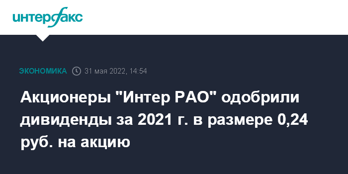 Акционеры "Интер РАО" одобрили дивиденды за 2021 г. в размере 0,24 руб. на акцию