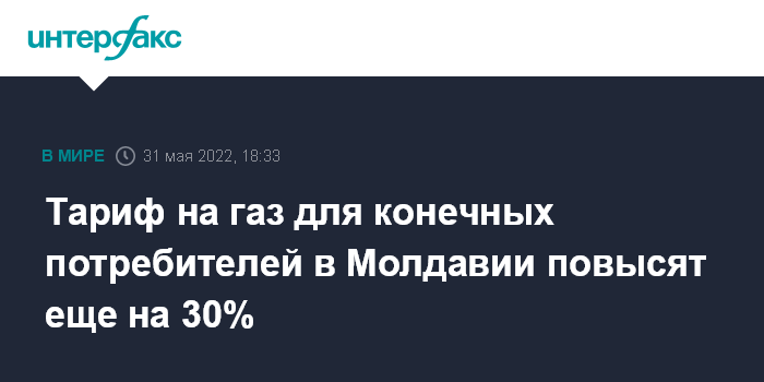 Москва. 31 мая. INTERFAX.RU - Тариф на газ для конечных потребителей в Молдавии повысится с 1 июня еще на 30%, соответствующее решение приняло во вторник Национальное агентство по регулированию в энергетике (ANRE) республики.