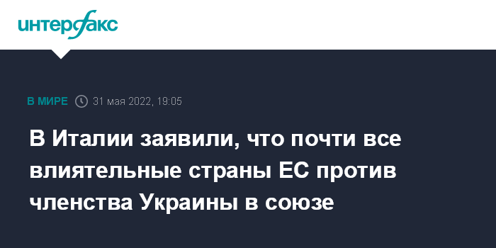 Москва. 31 мая. INTERFAX.RU - Италия - единственная из наиболее влиятельных стран ЕС, кто выступает за предоставление Украине статуса страны-кандидата на вступление в это объединение, заявил во вторник итальянский премьер Марио Драги.