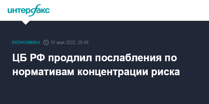 Москва. 31 мая. INTERFAX.RU - ЦБ РФ, как и анонсировал ранее, продлевает до конца 2022 года срок применения пониженного риск-веса по нормативам концентрации риска.
