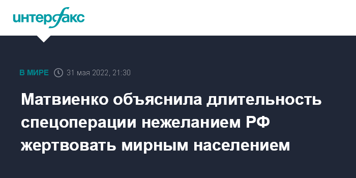 Москва. 31 мая. INTERFAX.RU - Россия могла быстро завершить специальную военную операцию на Украине, но не стала жертвовать мирным населением, заявила спикер Совета Федерации Валентина Матвиенко.