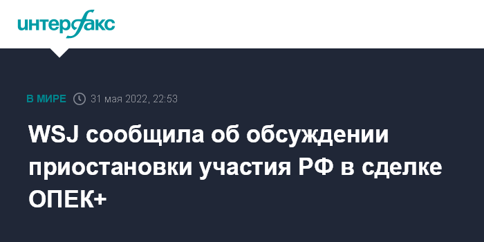 Москва. 31 мая. INTERFAX.RU - Некоторые члены ОПЕК изучают идею приостановки участия России в сделке по добыче нефти (ОПЕК+), поскольку западные санкции и частичный европейский запрет начинают подрывать способность Москвы добывать больше нефти, пишет The Wall Street Journal со ссылкой на неназванных делегатов ОПЕК.
