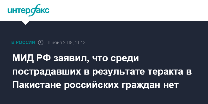 Москва. 10 июня. INTERFAX.RU - МИД РФ не подтверждает сообщения некоторых СМИ о гибели российского гражданина в результате недавнего теракта в Пакистане.