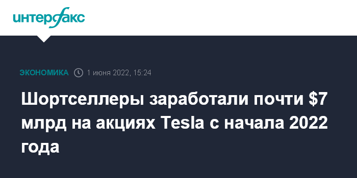 Москва. 1 июня. INTERFAX.RU - Глобальные инвесторы заработали $6,8 млрд на коротких позициях в акциях американского автопроизводителя Tesla Inc с начала 2022 года по прошлую пятницу, пишет MarketWatch со ссылкой на данные Ortex Research.
