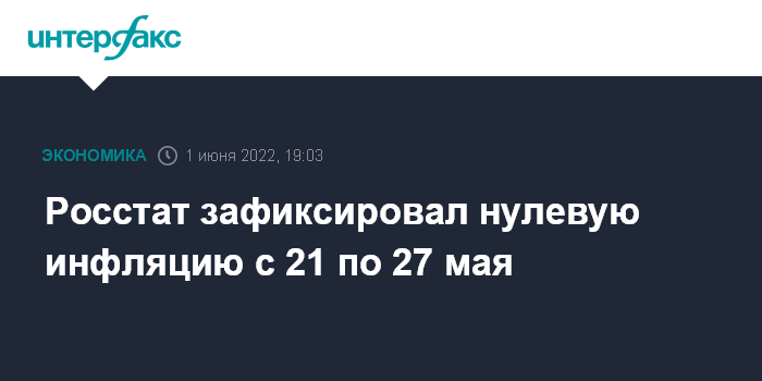 Москва. 1 июня. INTERFAX.RU - Росстат на неделе с 21 по 27 мая 2022 года зафиксировал в РФ нулевую инфляцию (0,00%) после дефляции в 0,02% с 13 по 20 мая, инфляции в 0,05% с 7 по 13 мая, 0,12% с 30 апреля по 6 мая, 0,21% с 23 по 29 апреля, сообщил в среду Росстат.