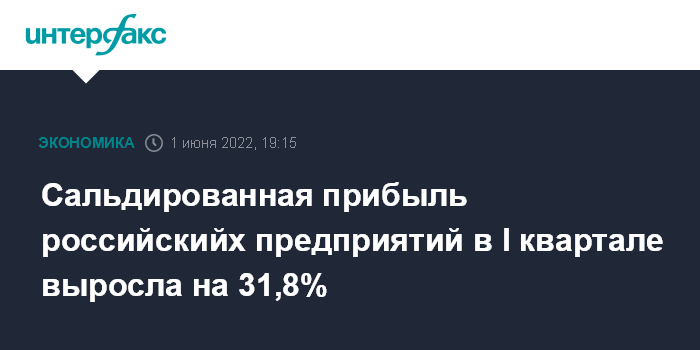 Москва. 1 июня. INTERFAX.RU - Российские предприятия в I квартале 2022 года получили сальдированную прибыль (прибыль минус убыток) в размере 7 трлн 120,6 млрд рублей, что на 31,8% больше, чем за тот же период 2021 года, говорится в сообщении Росстата.