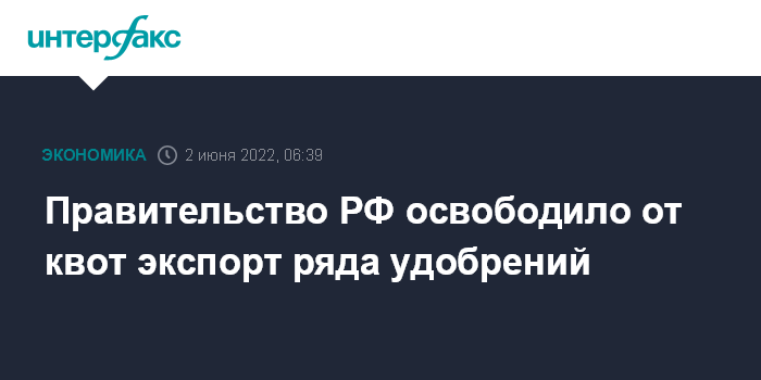Москва. 2 июня. INTERFAX.RU - Правительство РФ отменило квотирование экспорта ряда удобрений: диаммонийфосфата (DAP), нитрата натрия и смесей нитрата кальция и нитрата аммония.