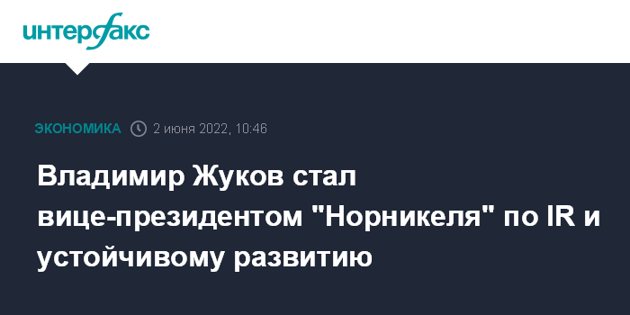 Москва. 2 июня. INTERFAX.RU - Вице-президент "Норникеля" по работе с инвестиционным сообществом Владимир Жуков станет вице-президентом по работе с инвесторами и устойчивому развитию, сообщила компания.