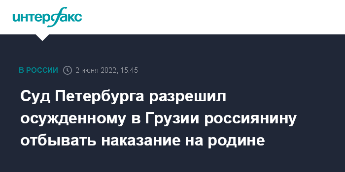 Москва. 2 июня. INTERFAX.RU - Санкт-Петербургский городской суд санкционировал передачу для отбывания наказания в РФ гражданина России, осужденного в Грузии по делу о наркотиках, сообщает в четверг объединенная пресс-служба судов города.