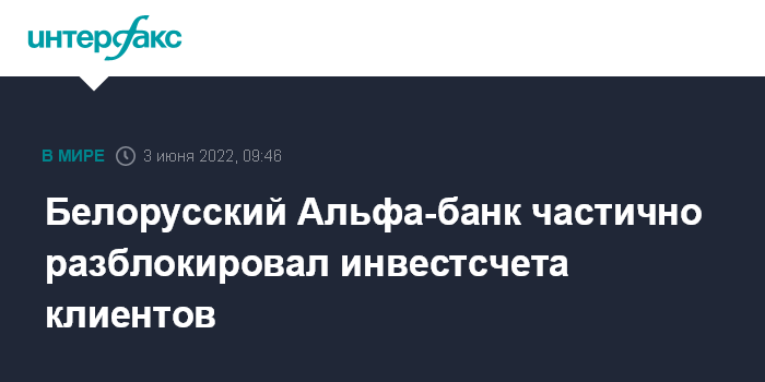 Москва. 3 июня. INTERFAX.RU - Белорусский Альфа-банк частично возобновил доступ клиентов к сервису доверительного управления (операции с ценными бумагами на фондовом рынке) за счет восстановления операций с "Московской биржей".
