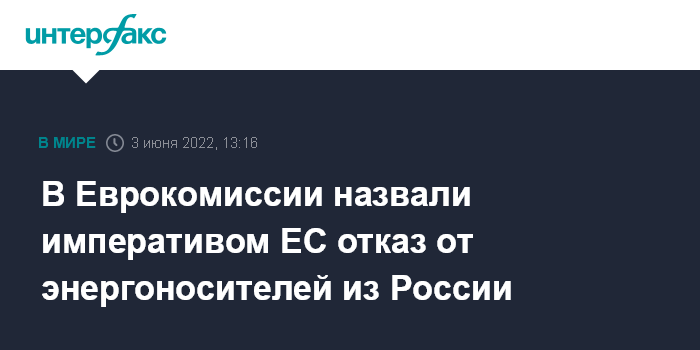Москва. 3 июня. INTERFAX.RU - Еврокомиссия (ЕК) приветствовала утверждение Советом ЕС шестого пакета санкций против РФ, подчеркнув продолжение европейского курса на сокращение зависимости Евросоюза от российских энергоносителей.